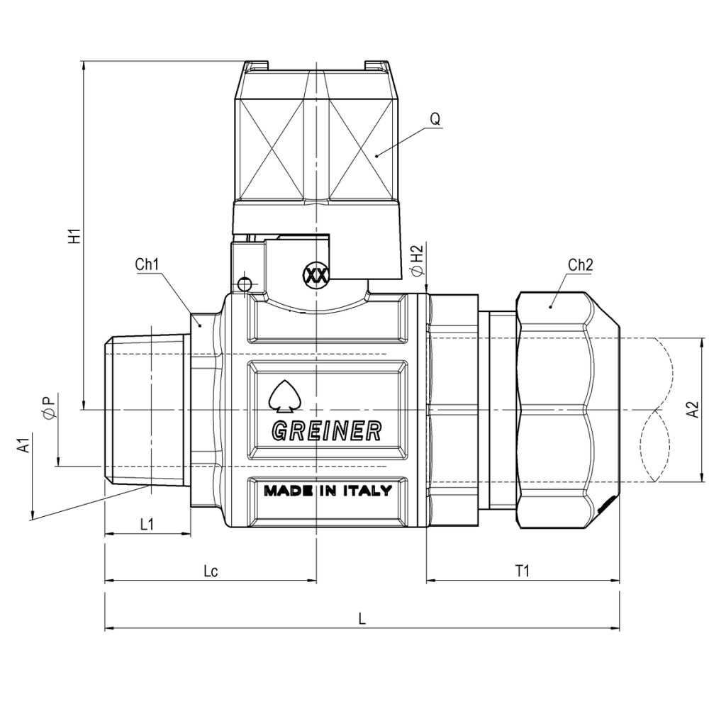 | L | L1 | A1 | A2 | H1 | ØH2 | ØP | Lc | Ch1 | Ch2 | T1 | Q | |||||